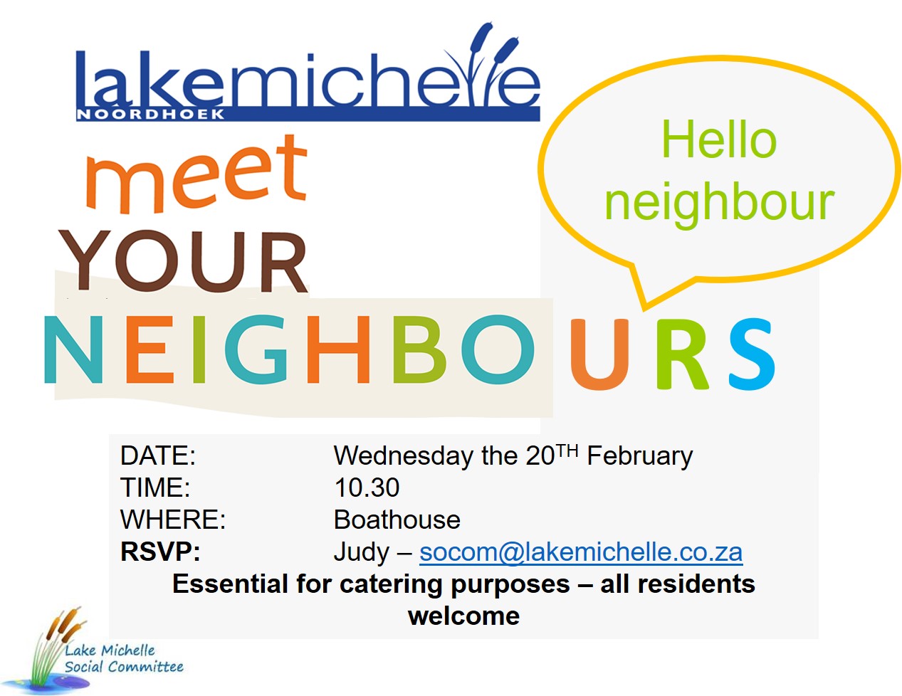 Just a reminder about the 'Meet your Neighbours' event at the Boathouse on Wednesday 20th February 2019 @ 10h30.