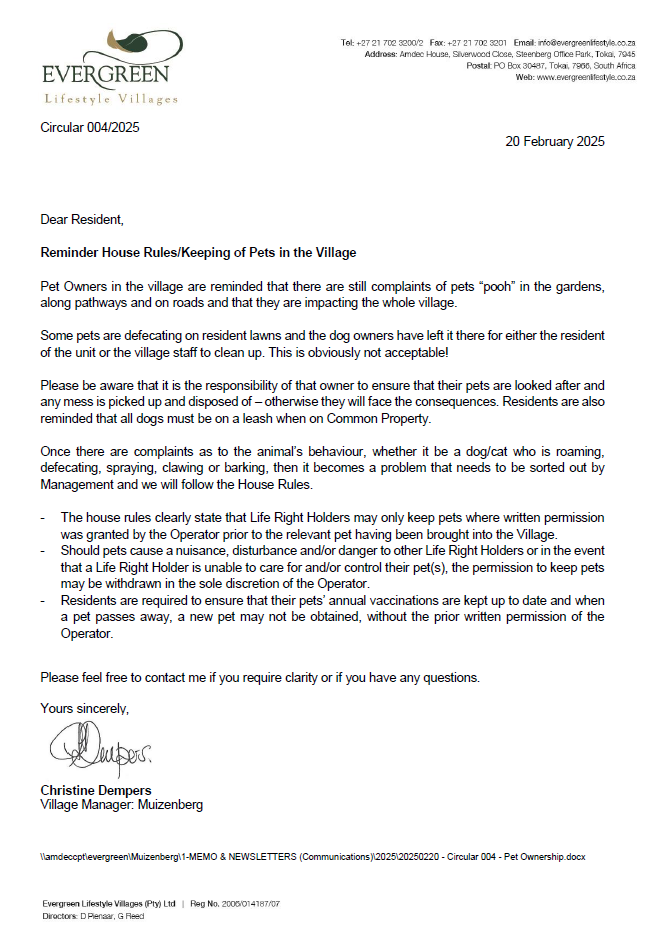 [Evergreen Muizenberg] ELV MZB>Circular 004 - Keeping Pets in the Village 20022025