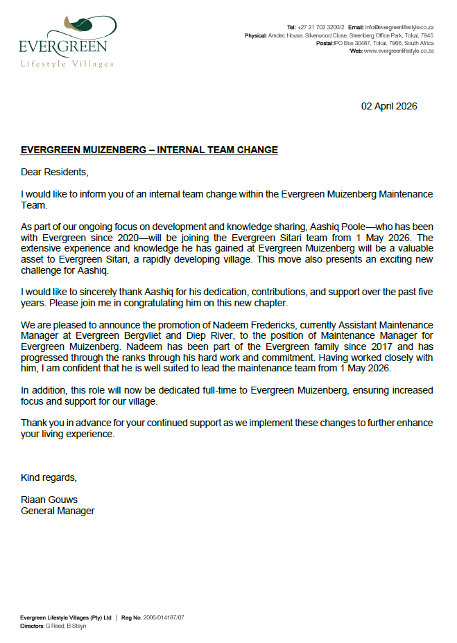 Desc: Evergreen Muizenberg - Internal Team Changes (Maintenance Manager).pdf