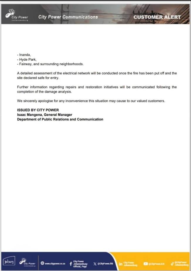 We would like to inform you that City Power has reported a significant outage affecting the Inner City and Alexandra, caused by a fire incident at the Cydna Substation.