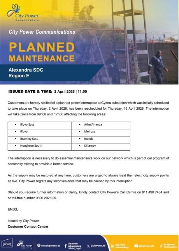 Please take note of the planned power interruption at Cydna Substation, scheduled for Thursday, 16 April 2026.
